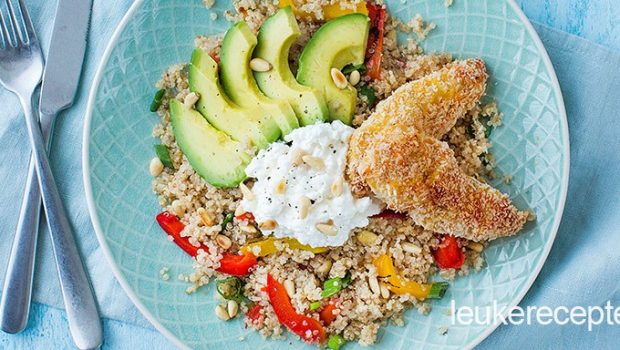 Gezonde quinoa salade met geroosterde paprika, avocado en krokante kip uit de oven