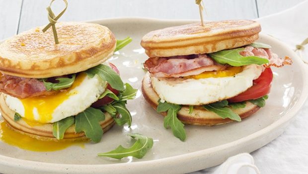Deze hartige burgers van American pancakes met ei en spek zijn leuk en lekker als ontbijt of lunch