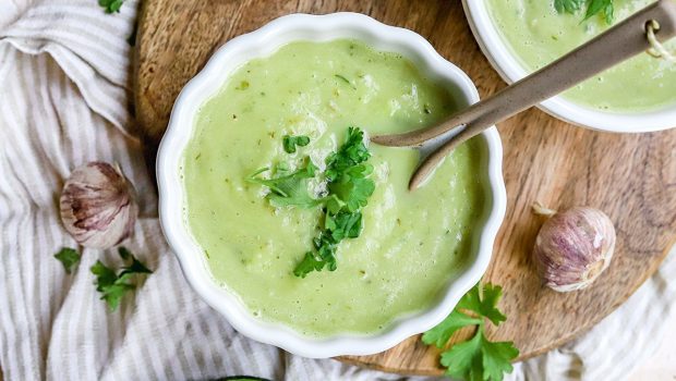 Een heerlijke gezonde avocadosoep met courgette en peterselie die lekker romig is en binnen 20 minuten op tafel staat