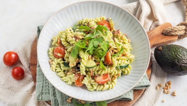 Maak zelf deze romige pasta op basis van avocadosaus met (vega)spekjes en tomaatjes. Een heerlijk en makkelijk pastagerecht.