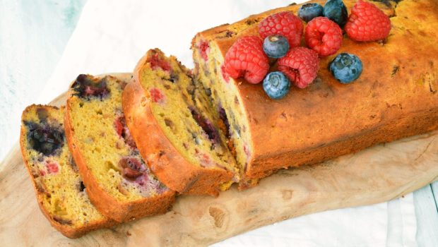 Heerlijk zoet bananenbrood met dadels en rood fruit. Dit bananenbrood is een erg lekker tussendoortje. Gezoet met natuurlijke suikers zoals dadels.