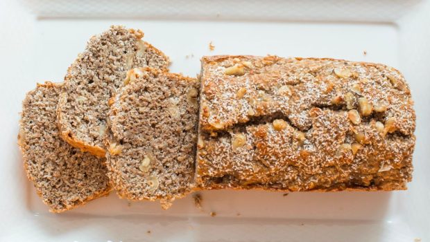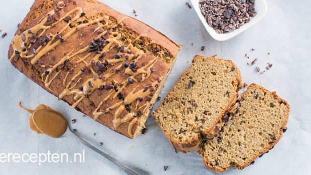 Dit licht zoete bananenbrood is gemaakt met amandelmeel en is daarom glutenvrij! Heerlijk met een vleug pindakaas en stukjes cacao nibs.