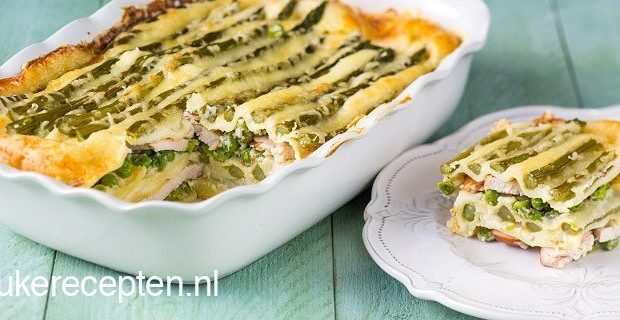 Heerlijke lente lasagne met laagjes gerookte kip, groene asperges en zelfgemaakte bechamelsaus