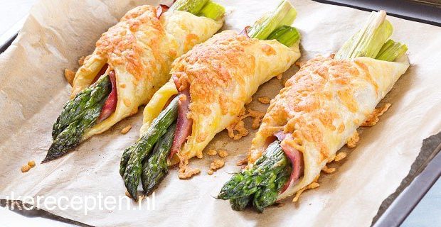 Lekker hartig pakketje van asperges omwikkeld met ham en bladerdeeg en een korstje kaas.