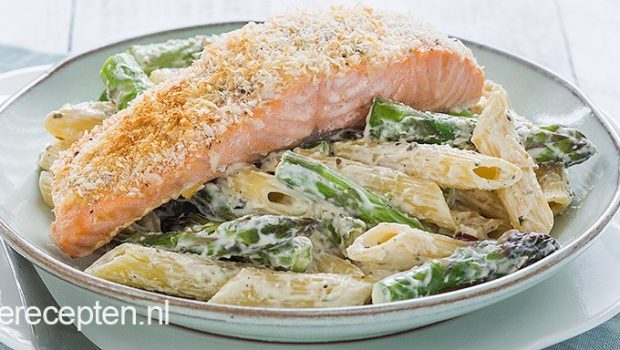 Romige pasta met groene asperges met een lekker stukje zalm met krokant korstje