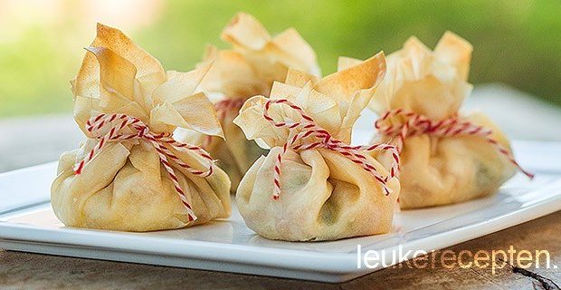 Lekker en verrassend borrelhapje of voorgerecht gevuld met geitenkaas, spek en bosui