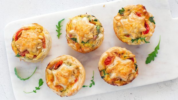 Maak deze mini Kerst quiches gevuld met tomaatjes, rucola en rauwe ham. Extra feestelijk met de sterren van bladerdeeg erbovenop.
