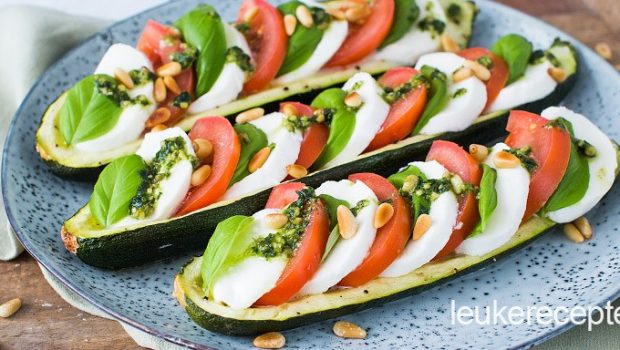 Gezonde en koolhydraatarme lunch of bijgerecht van gevulde courgette met mozzarella en tomaat.