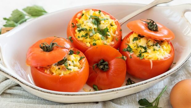 Een simpel maar lekkere gerechtje voor bij de (paas)lunch van gevulde tomaten uit de oven met roerei, en bovendien koolhydraatarm.