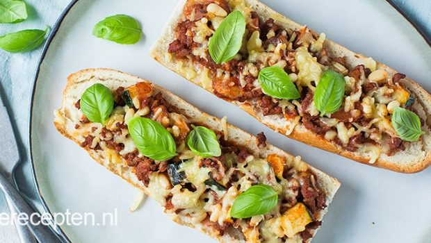 Lekkere lunch of simpele maaltijd: gegratineerde stokbroodjes met gehakt en groenten