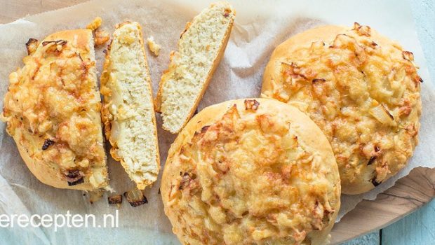 Recept voor kaas uienbroodjes uit de oven. Zelfgemaakte broodjes met een heerlijke topping van gebakken ui en kaas. Simpel, snel en heerlijk om eens zelf te maken.