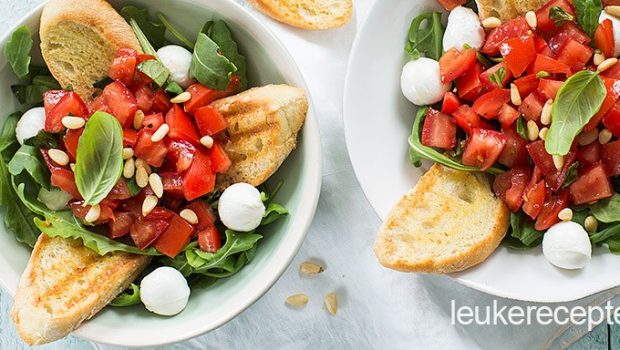 Een salade van knapperig geroosterd brood met gemarineerde tomaatjes.