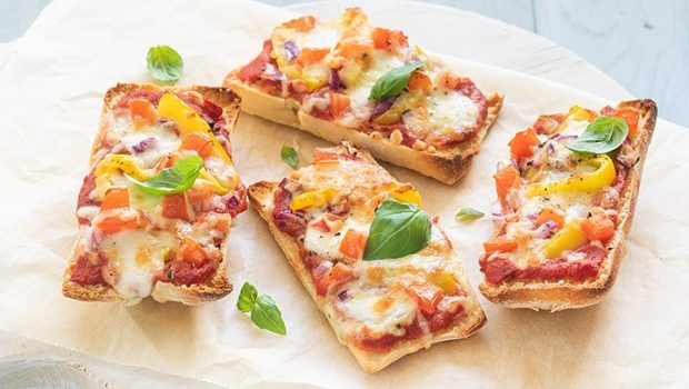 Een makkelijke snack of lunch van pizza broodjes met een lekkere topping van pizzasaus, groenten en kaas