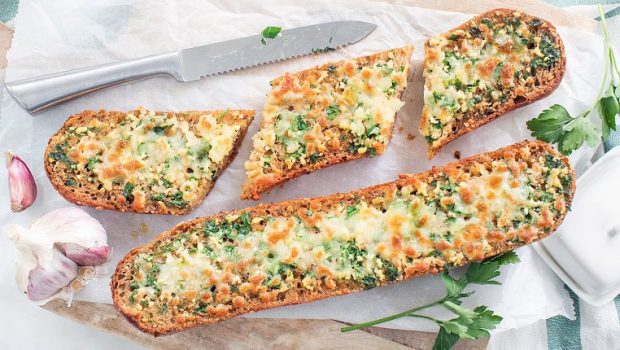 Brood met een laagje romige knoflookboter en kaas uit de oven. Serveer het in sneetjes bij de borrel of lekker om bij de lunch in je soep te dippen.