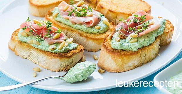 Lenterecept: bruschetta's met een frisse spinazie-geitenkaas spread en een plakje parmaham