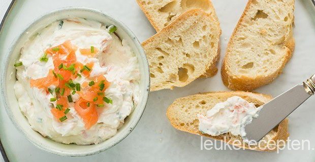 Romige zelfgemaakte zalm spread met roomkaas, Griekse yoghurt, bieslook en gerookte zalm. Heerlijk om op een stukje brood of toastje te smeren. En binnen 10 minuten al gemaakt!