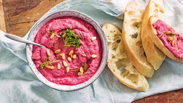 De rode bieten spread met geitenkaas is een heerlijke spread voor op bruschetta, de boterham of voor op de borrelplank.