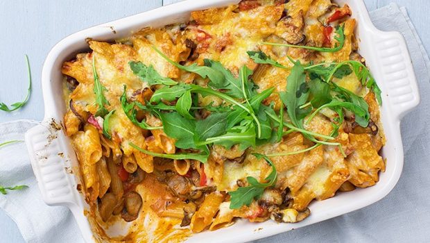 Deze pastaschotel met stroganoffsaus gegratineerd onder een laagje kaas is een heerlijke vegetarische maaltijd en het ideale comfortfood