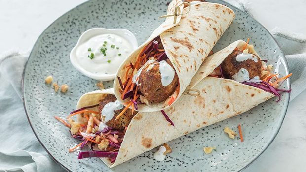 Deze wraps met falafel zijn gevuld met een lekkere salade van wortel, rode kool en appel en afgemaakt met een sausje van Griekse yoghurt