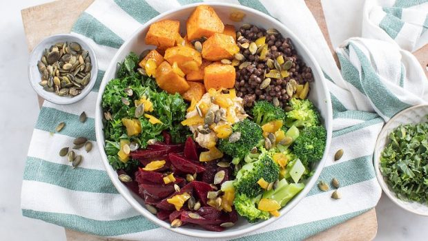 Met deze winter bowl krijg je een groot aantal winterse groentes binnen. Lekker met een schepje zelfgemaakte hummus en geroosterde pitjes.
