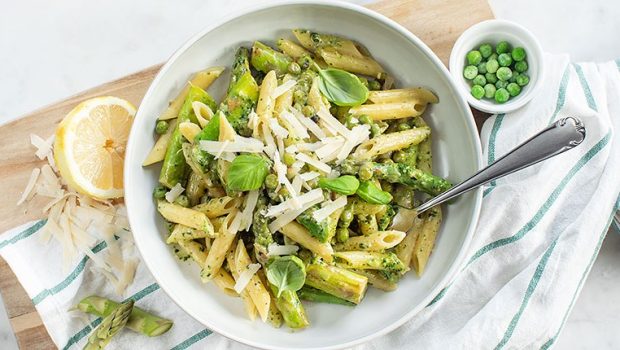 Een lekkere groene pasta met asperges en erwtjes in een romige pestosaus die lekker fris smaakt door de toegevoegde citroen.