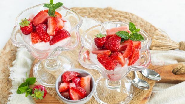 Een heerlijk en makkelijk toetje van slagroom en Griekse yoghurt met gepureerde aardbeien. Geserveerd in een glazen kommetje met verse aardbeien in een vleugje wodka, versierd met een muntblaadje voor de finishing touch.