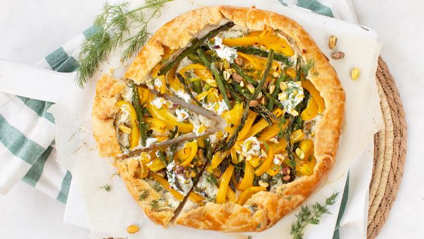 Een galette is een hartige Franse open taart met een rustieke korst. Je kunt deze vullen met hartige en zoete vullingen. In dit recept ging ik voor groene asperges, paprika en een frisse ricotta met citroen en dille Echt een super combinatie en ideaal voor Pasen voor bij de paasbrunch.