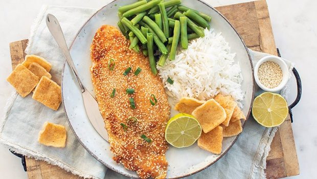 Vis in een krokante korst van sesam met een Oosterse twist, door de korst blijft de vis lekker mals en niet droog