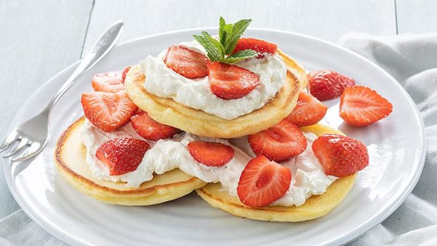 Lekkere luchtige pancakes met verse aardbeien en slagroom. Een lekker verwenontbijtje voor Moederdag of Valentijnsdag.