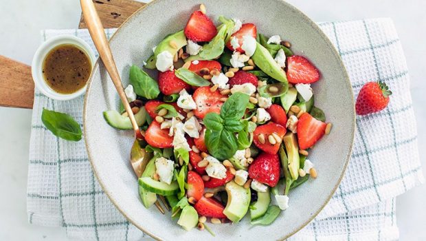 Heerlijke frisse salade met geitenkaas, basilicum en aardbeien en een lichte balsamico dressing