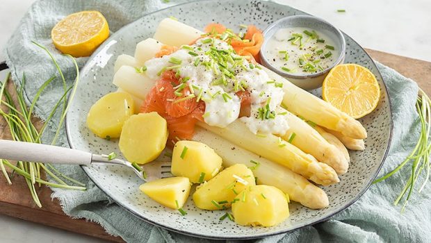 Gerookte zalm en asperges zijn een perfecte combinatie. Zeker met deze romige bieslooksaus en gekookte aardappeltjes erbij.
