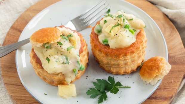 Geniet van een heerlijke zelfgemaakte romige aspergeragout in een knapperig pasteibakje. Met verse witte asperges en erwtjes, lekker voor een speciale gelegenheid of gewoon voor een gezellig diner thuis.