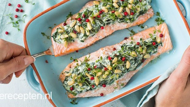Zalm met een romige vulling van spinazie, een feestelijk gerecht voor de Kerst