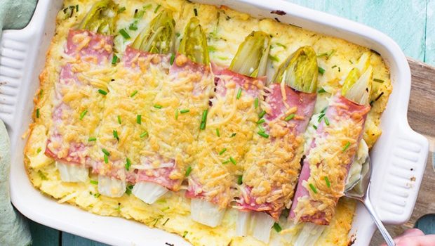 Heerlijke witlof ovenschotel met aardappel. Gemaakt van witlof rolletjes op een laagje romige aardappelpuree met bieslook, met ham en gegratineerde kaas.