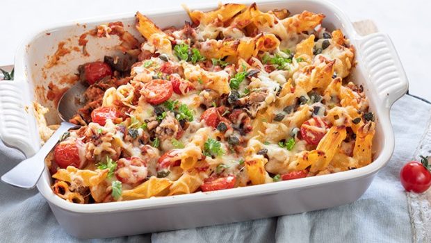 Heerlijke Italiaanse ovenschotel met pasta, tonijn uit blik en aubergine onder een gegratineerd laagje kaas