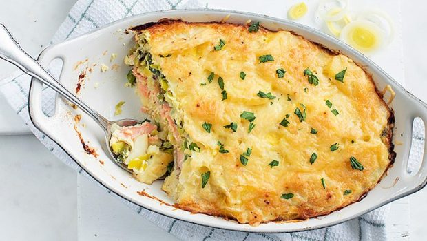 Heerlijke ovenschotel van laagjes aardappel, prei en zalm in een romige saus gegratineerd met kaas