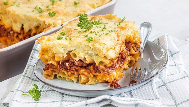 Heerlijke kruidige pastaschotel uit Griekenland, ook wel pastistio genoemd, met laagjes van pasta, gehaktmengsel met oregano en kaneel en een zelfgemaakte bechamelsaus.