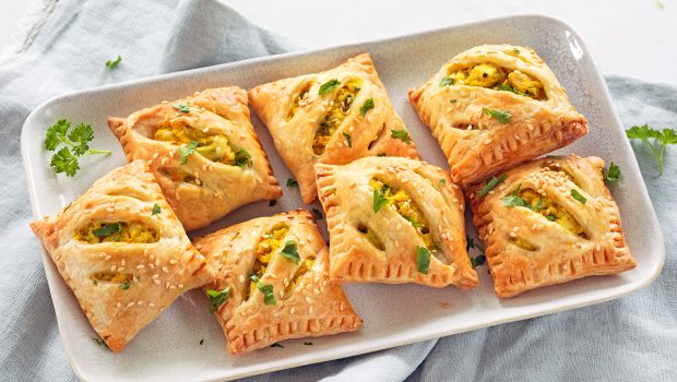 Krokante bladerdeeghapjes met een romige vulling van kip kerrie. Een ideale borrelsnack.