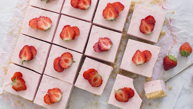 Dit frisse gebak met verse aardbeien is heerlijk romig en zacht en heerlijk op een zomerse dag