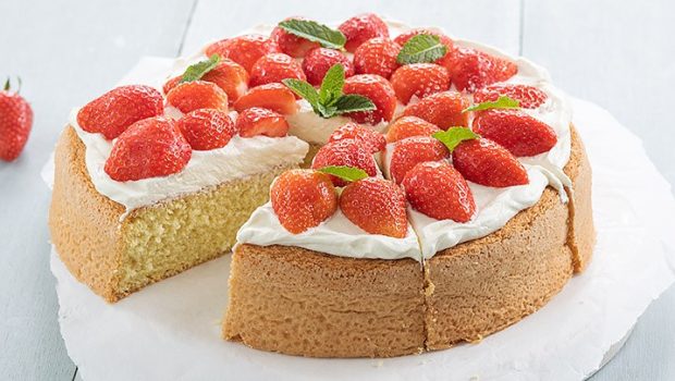 De perfecte zomerse taart; luchtige biscuittaart met slagroom topping en verse aardbeien. Ook lekker voor Moederdag.