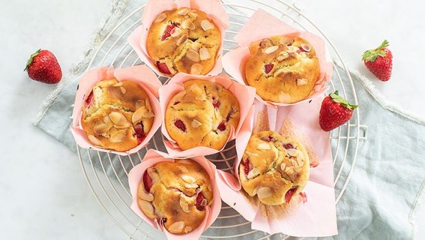 Heerlijke luchtige muffins met stukjes verse aardbei en een vleugje vanille