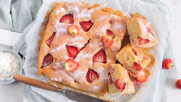 Heerlijke zachte cake met verse aardbeien en een vleugje vanille. In 15 minuten zet je het gerecht in de oven. Lekker met slagroom.