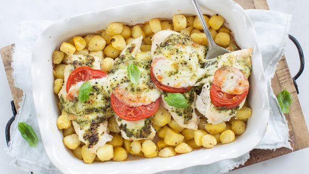 Makkelijke ovenschotel van aardappeltjes met kip en een Italiaanse twist van pesto, tomaat en mozzarella