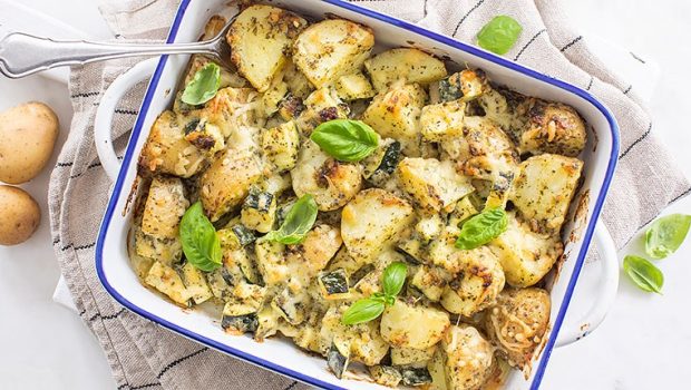 Aardappels uit de oven in een lekkere romige pesto saus. Een veelzijdig bijgerecht dat bijna overal lekker bij smaakt.