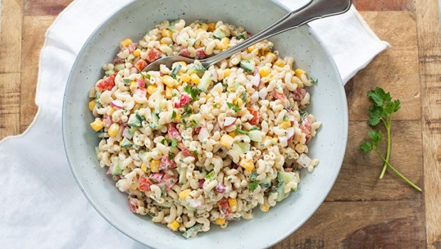 Op warme dagen maak ik graag deze verfrissende koude macaroni salade met komkommer en tomaat, een ideaal (bij)gerecht dat je gemakkelijk van tevoren kunt bereiden. Deze salade is lekker romig dankzij Griekse yoghurt en mayonaise, maar blijft toch luchtig en fris. Door de radijsjes en maïs krijgt hij net dat beetje extra kleur en bite. Perfect om koel te bewaren in de koelkast, zodat de smaken goed intrekken voor je bijvoorbeeld gaat barbecueën. Deze heerlijke frisse salade is binnen 20 minuten klaar en een echte populair zomerrecept bij mij thuis.