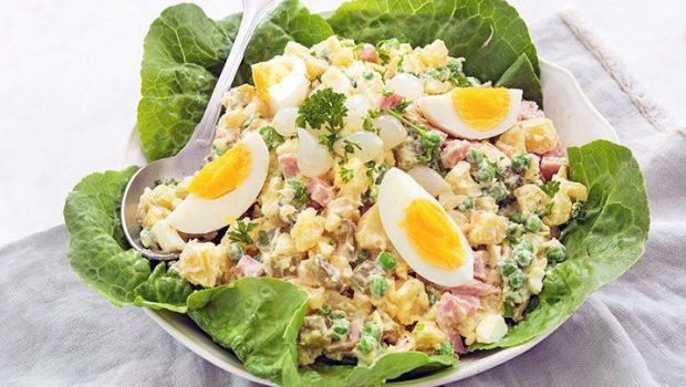 Makkelijk recept voor een heerlijke huzarensalade met aardappel, augurkjes, ei en ham. Een klassieke salade voor bij de BBQ.