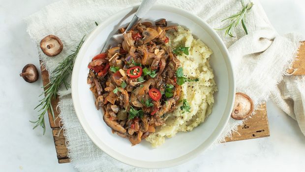 Overheerlijke snelle stoofschotel met verschillende paddenstoelen en herfstige kruiden samen met een romige pastinaakpuree.