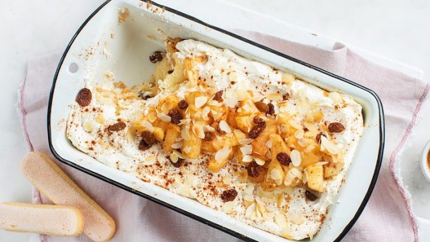 Dit dessert is een combi van tiramisu en appeltaart en bevat stukjes appel, lange vingers en kaneel en bovendien geen alcohol of ei! Een heerlijk toetje