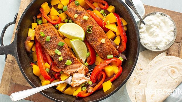 Mexicaanse zalm met gegrilde groenten geserveerd in een pannetje met wraps en lekkere toppings