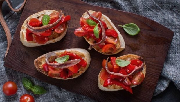 Een heerlijk hapje van knapperige broodjes met gegrilde paprika en ansjovis. Lekker als voorafje of als borrelhapje.